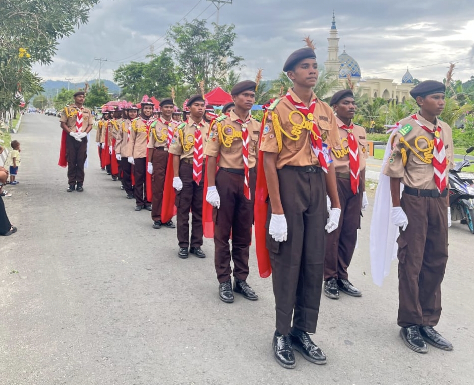 Dengan nomor dada 026, tim MAN 1 Halmahera Tengah tampil memukau di hadapan dewan juri dan penonton. Kostum Pramuka yang mereka kenakan semakin unik dengan balutan sayap dari kain merah dan putih, melambangkan semangat nasionalisme dan persatuan.